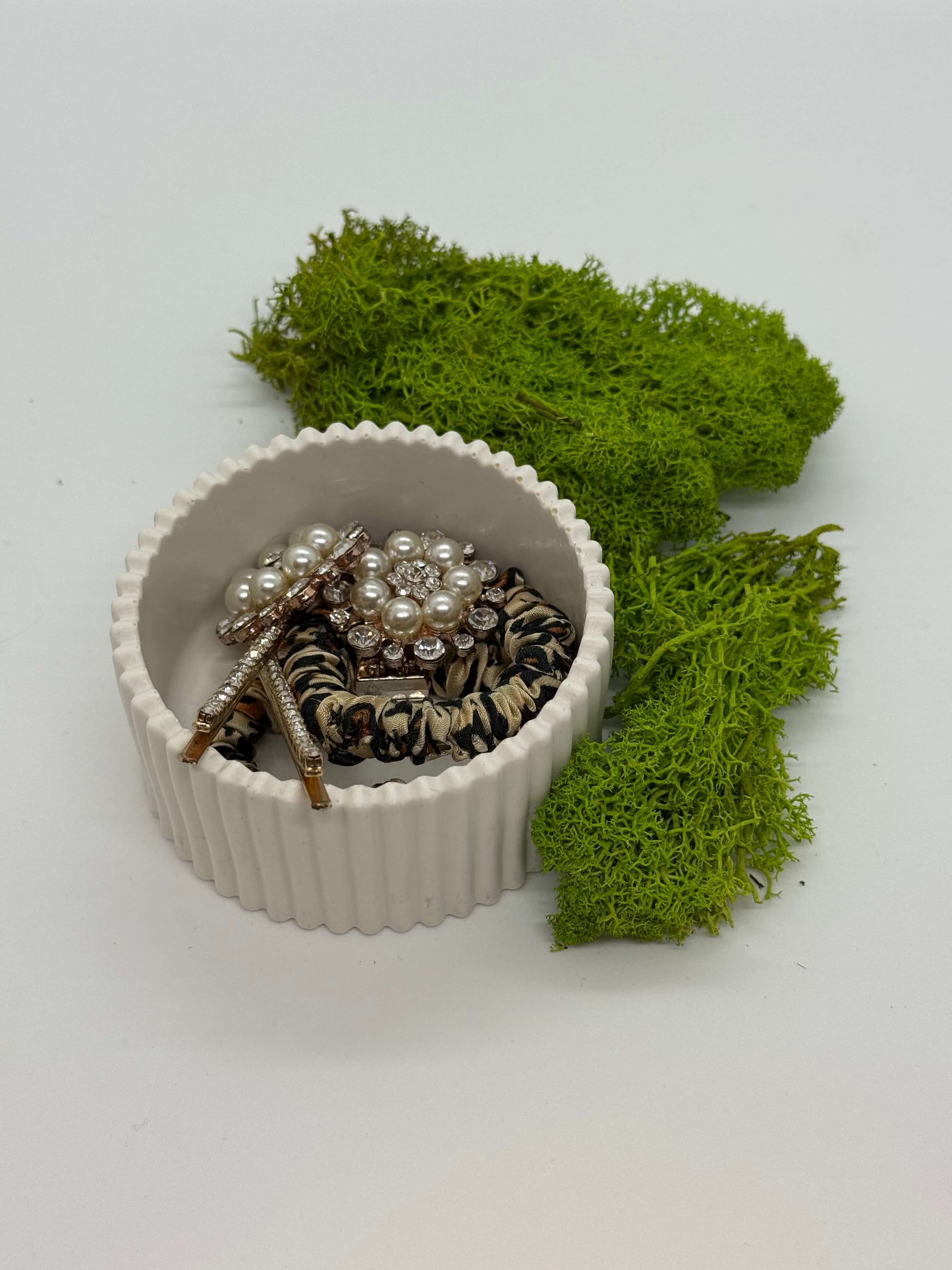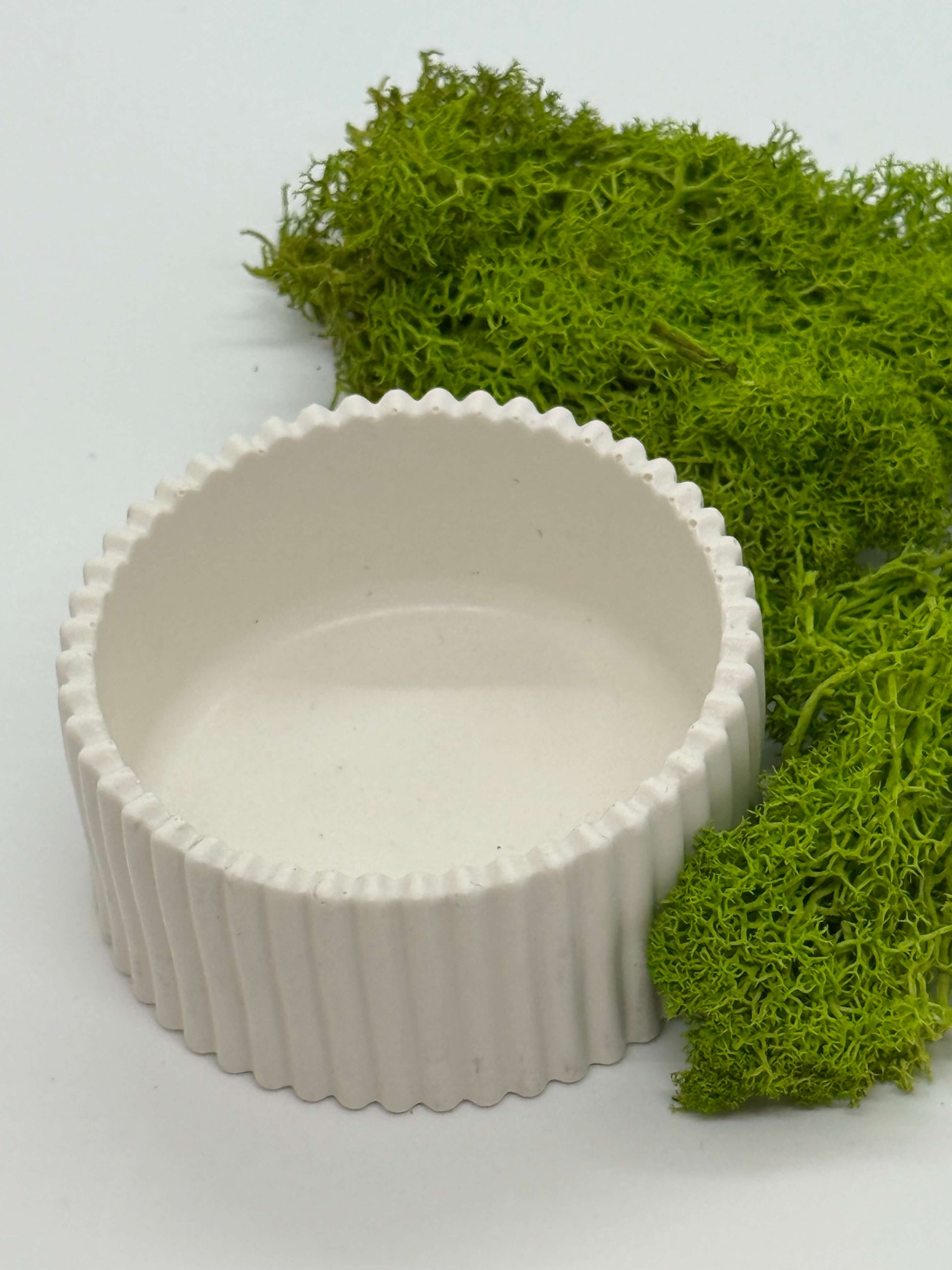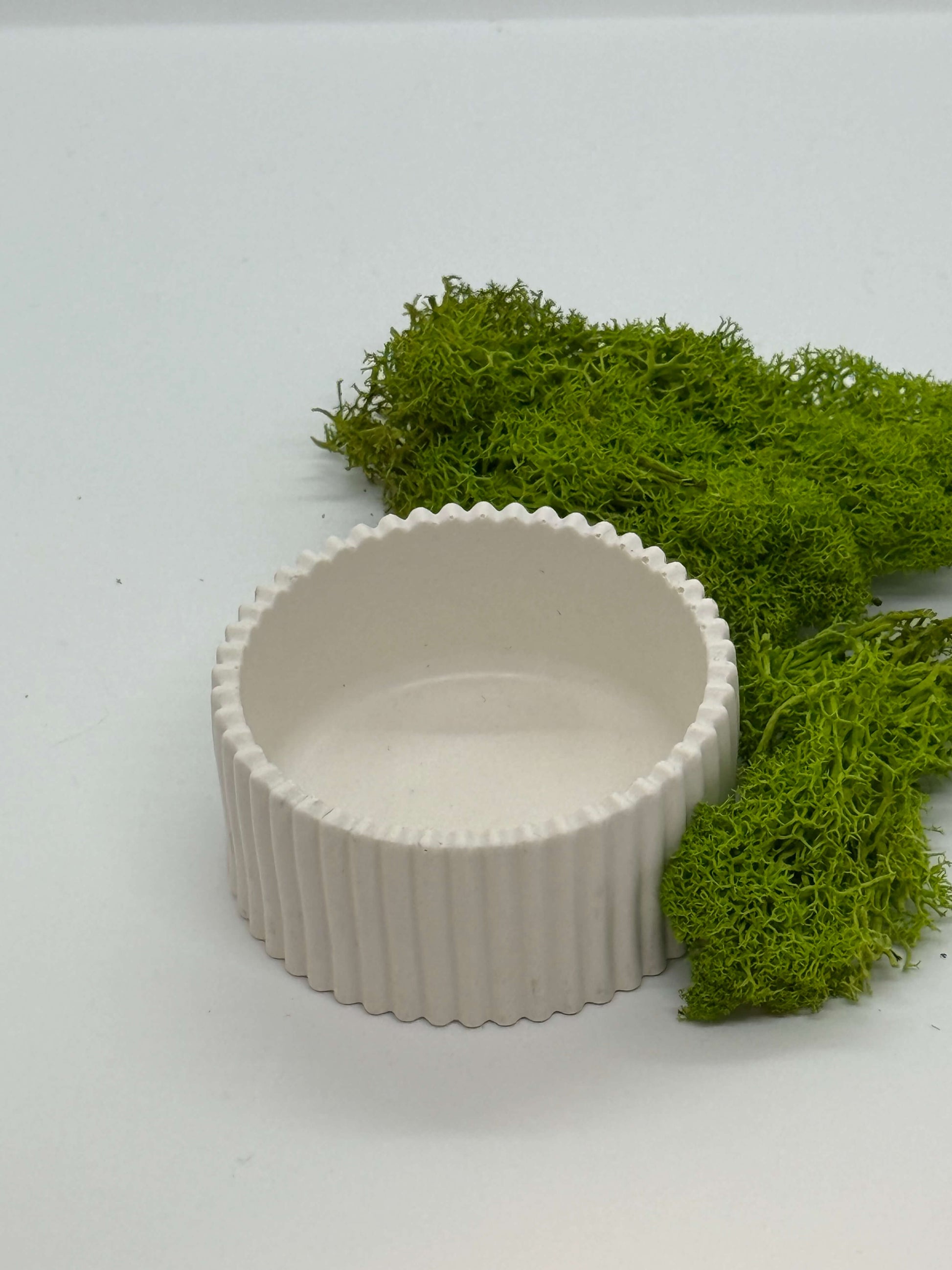 Baltas, elegantiškas indelis su vertikalių griovelių raštu. Tvirta, matinė medžiaga suteikia jam subtilios prabangos ir natūralumo pojūtį. Dėl minimalistinės formos indelis dera įvairiuose interjeruose ir tinka smulkmenoms, papuošalams ar kitoms mažoms detalėms laikyti.