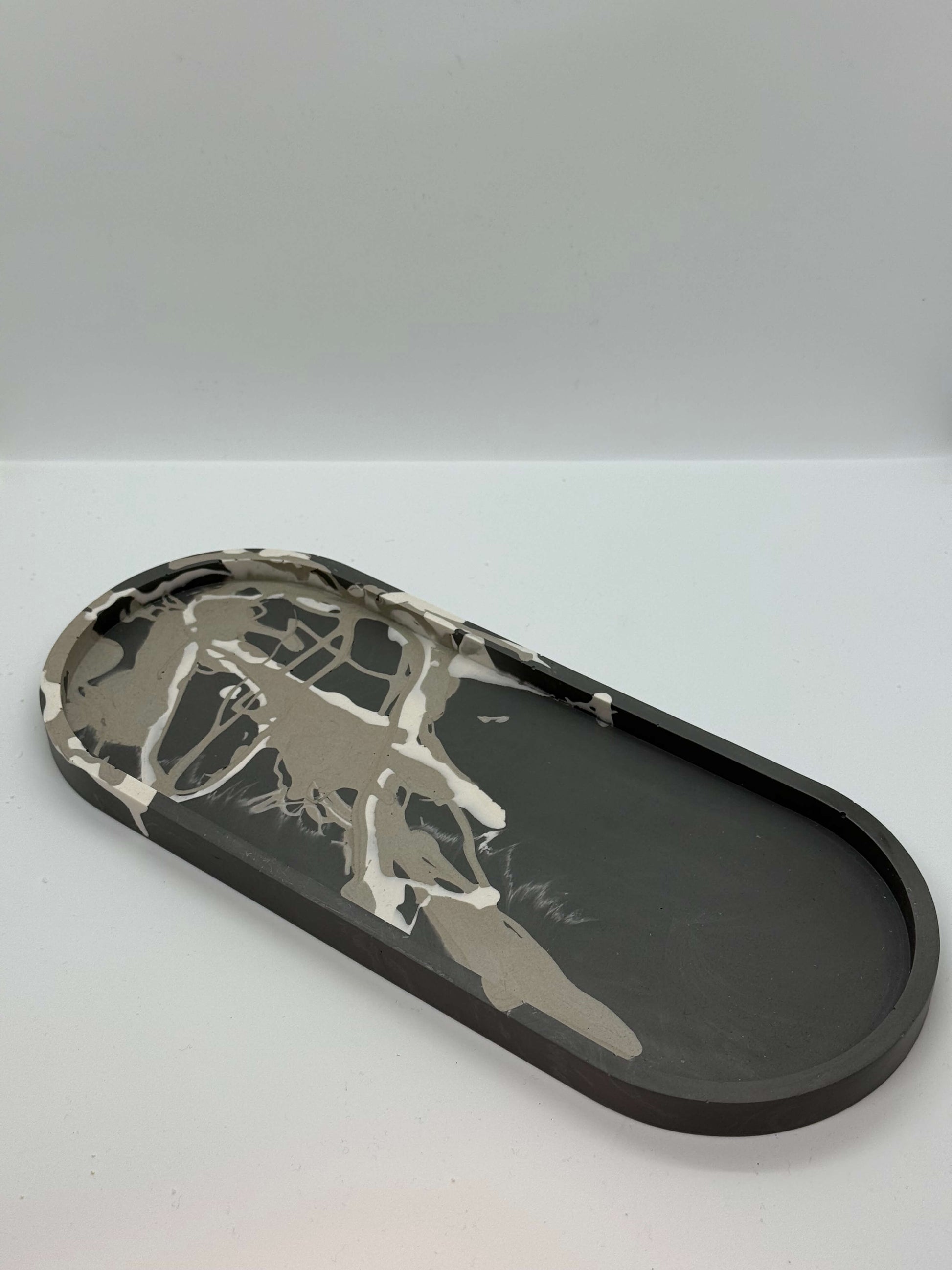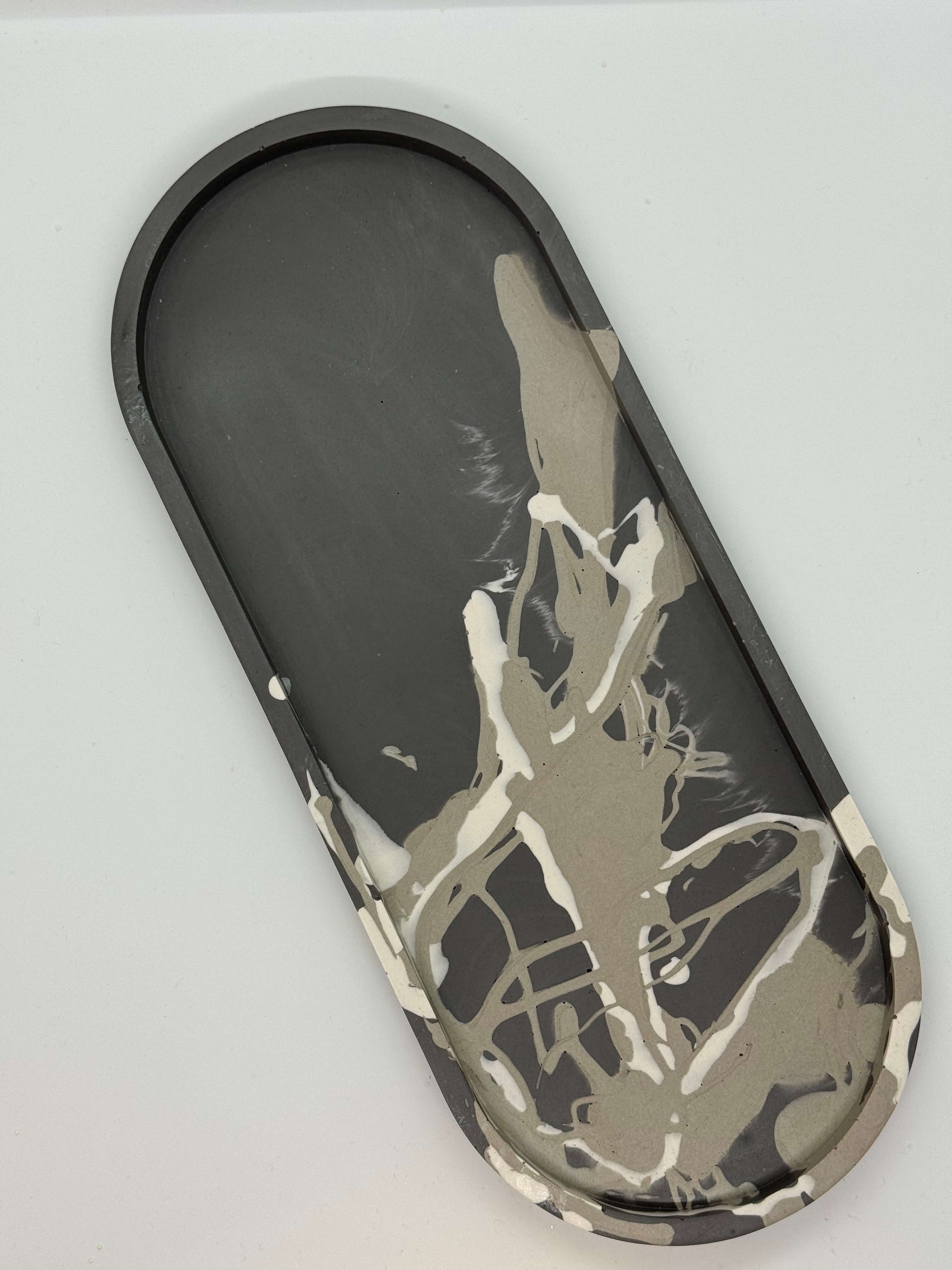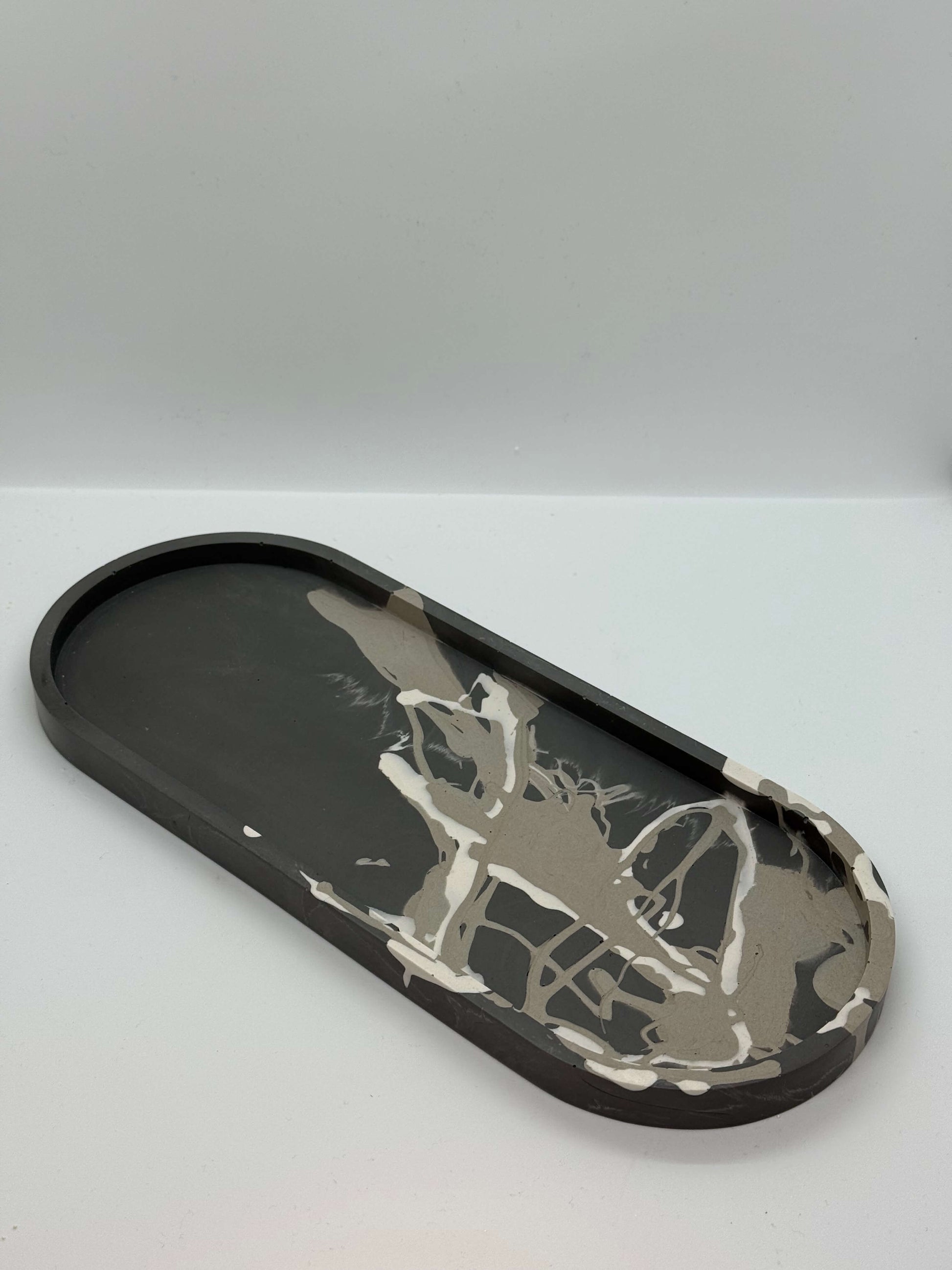 Elegantiškos pailgos formos padėklas su išraiškingu marmuro raštų dizainu. Kiekvienas gaminys – unikalus meno kūrinys jūsų namams.
