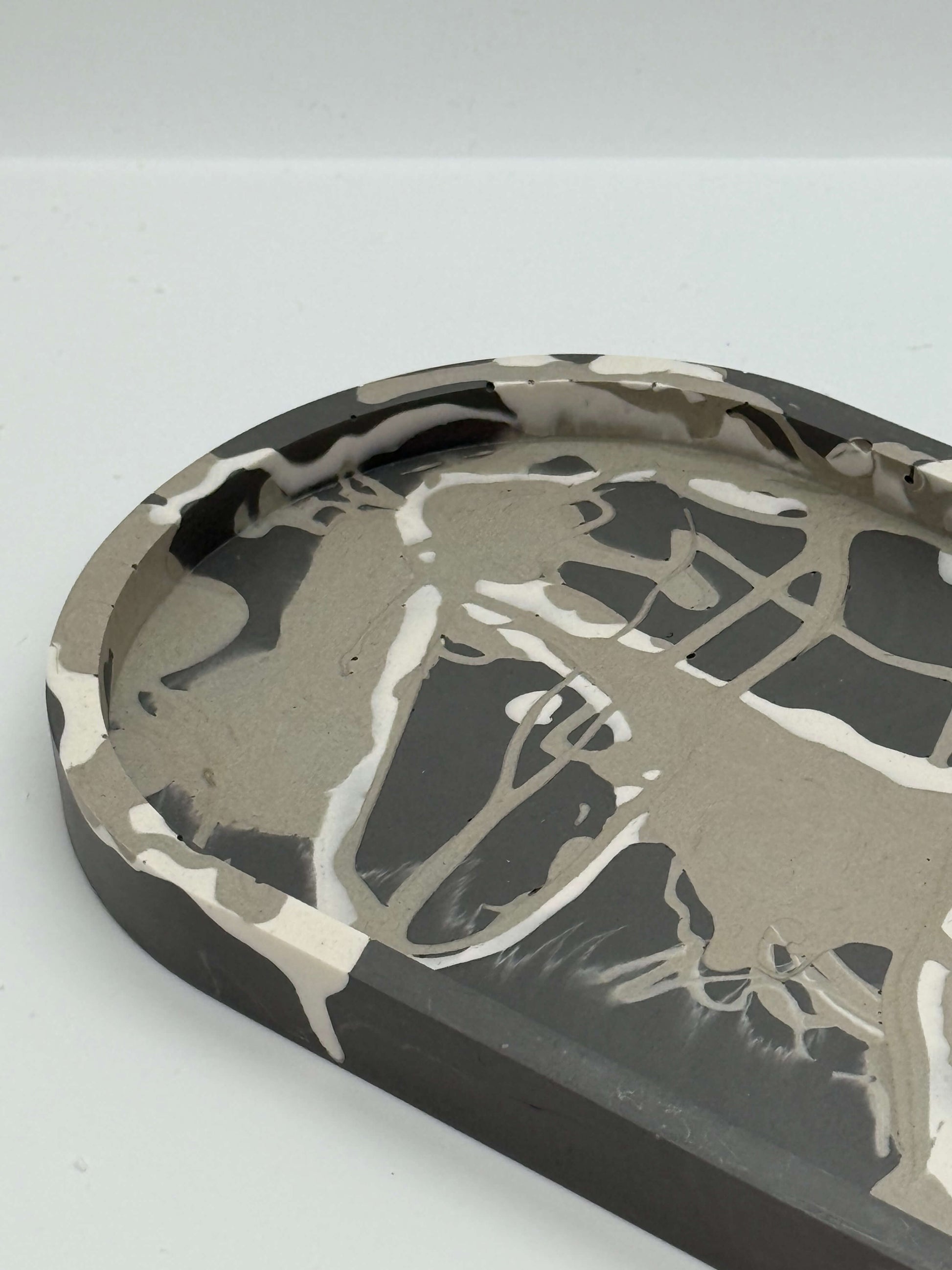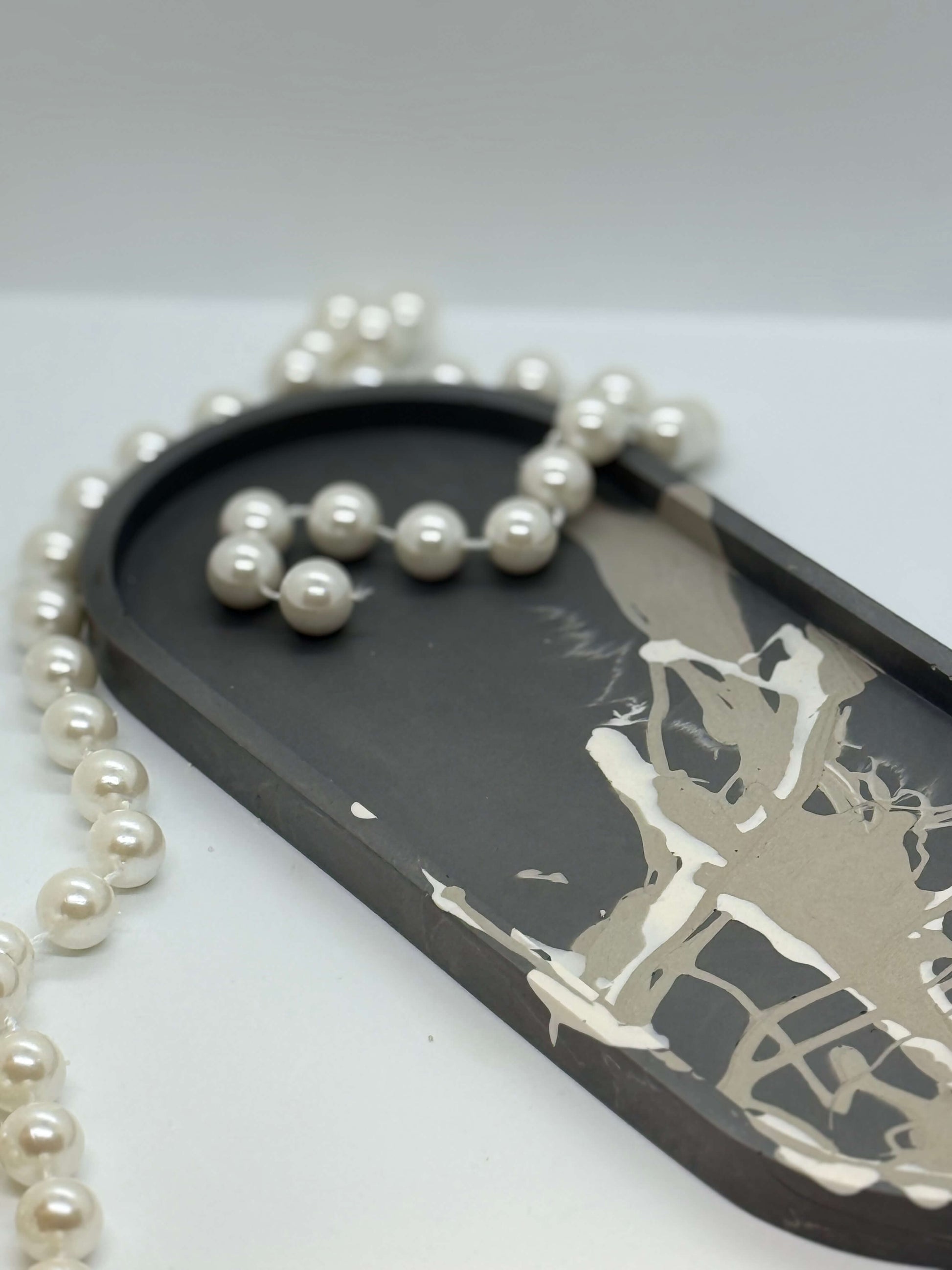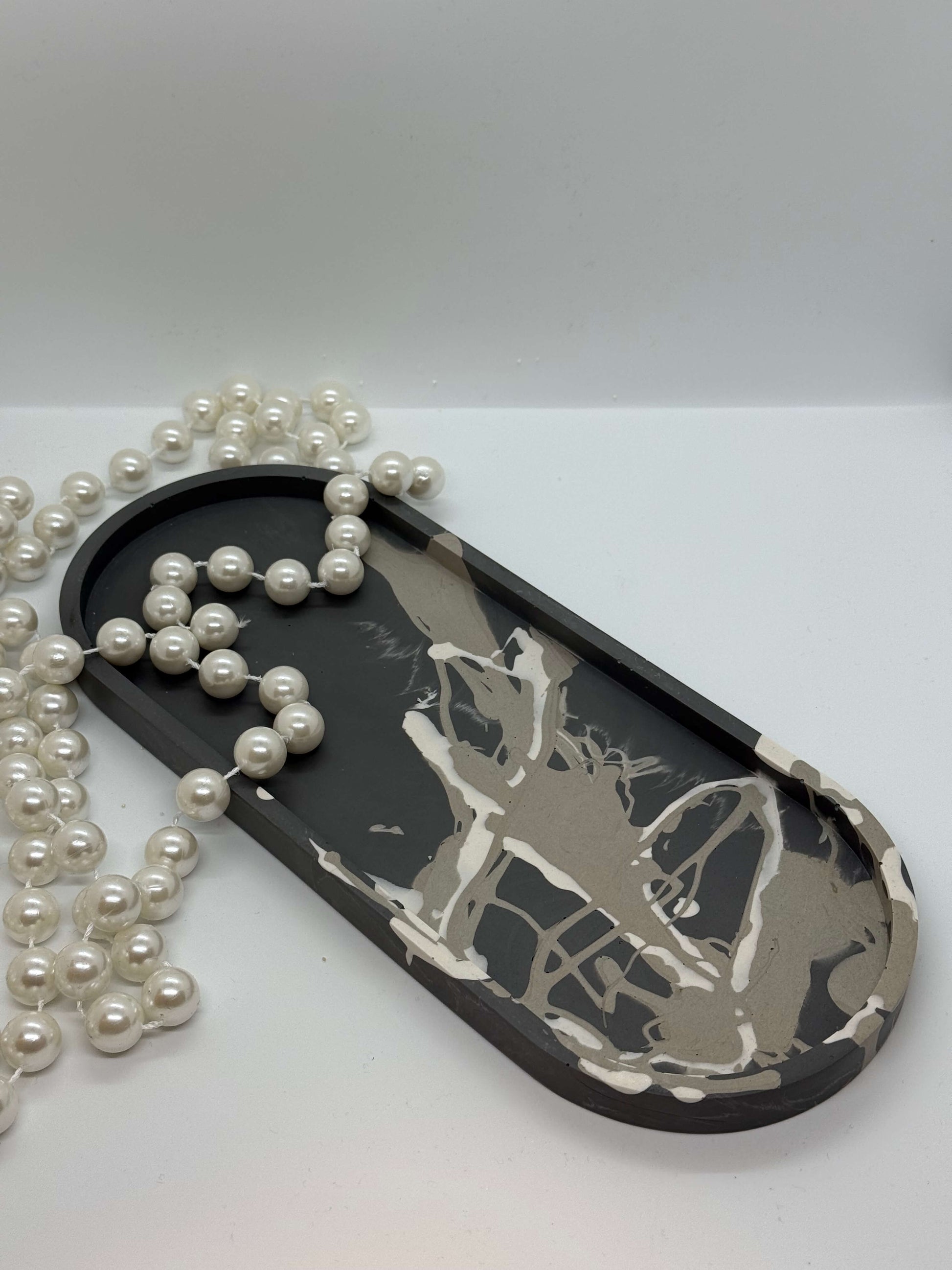 Elegantiškos pailgos formos padėklas su išraiškingu marmuro raštų dizainu. Kiekvienas gaminys – unikalus meno kūrinys jūsų namams.