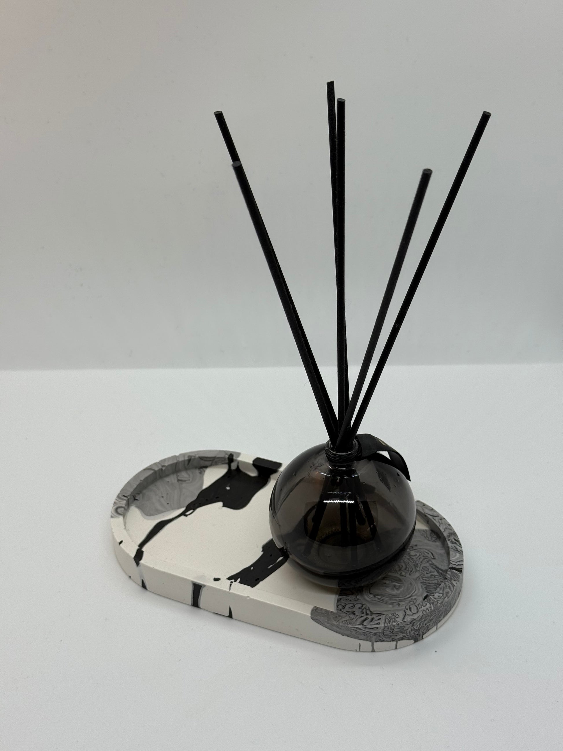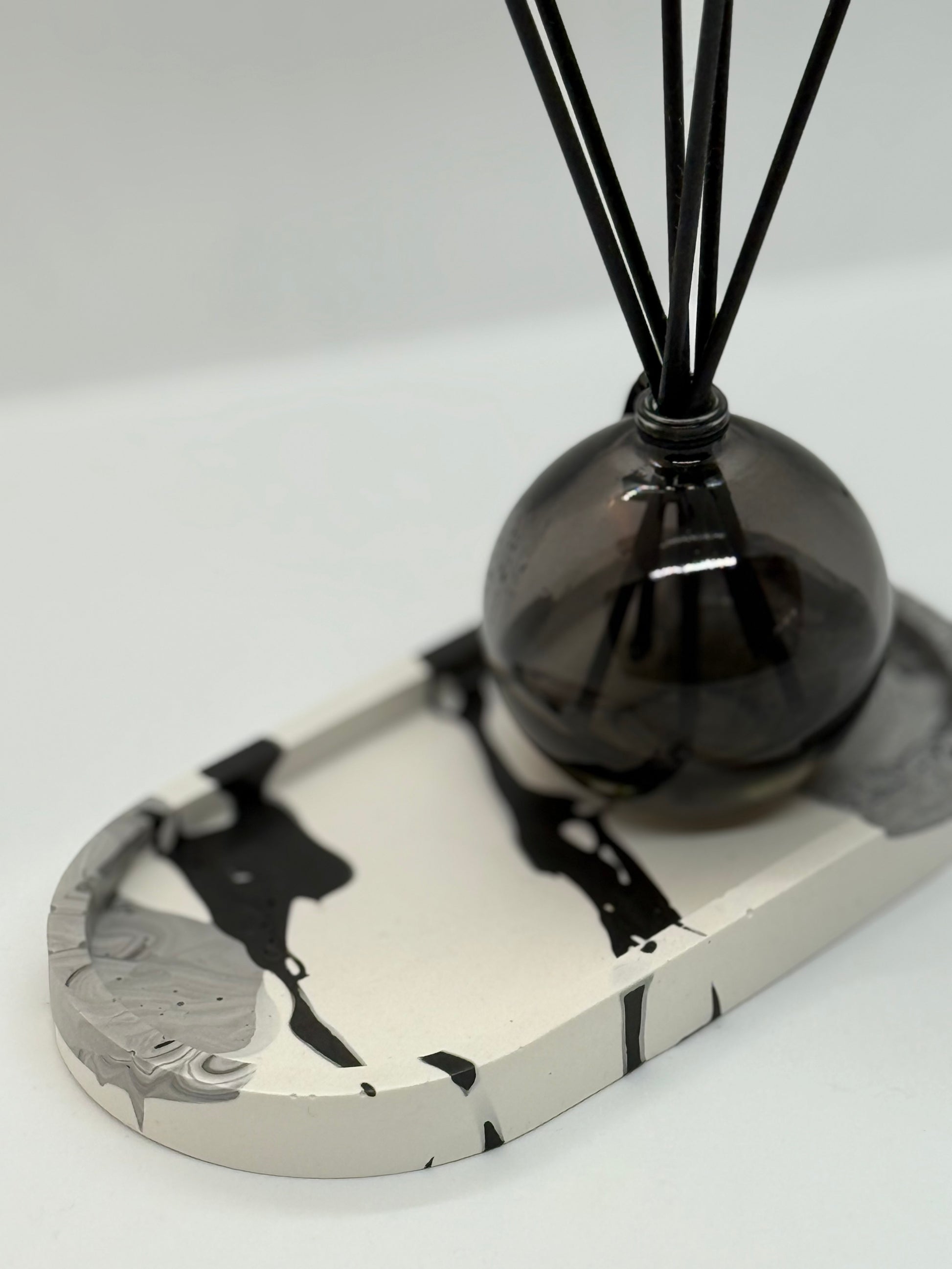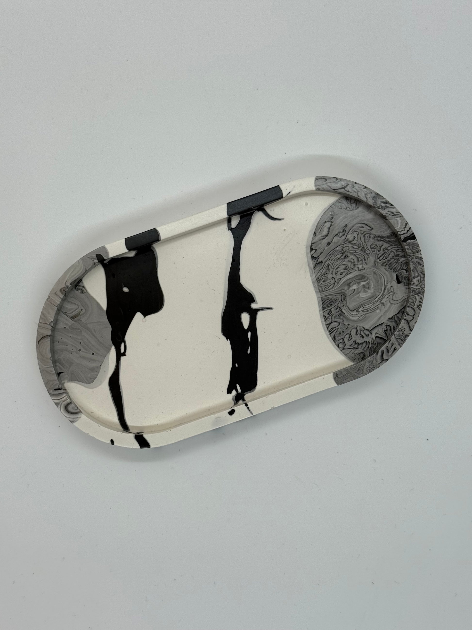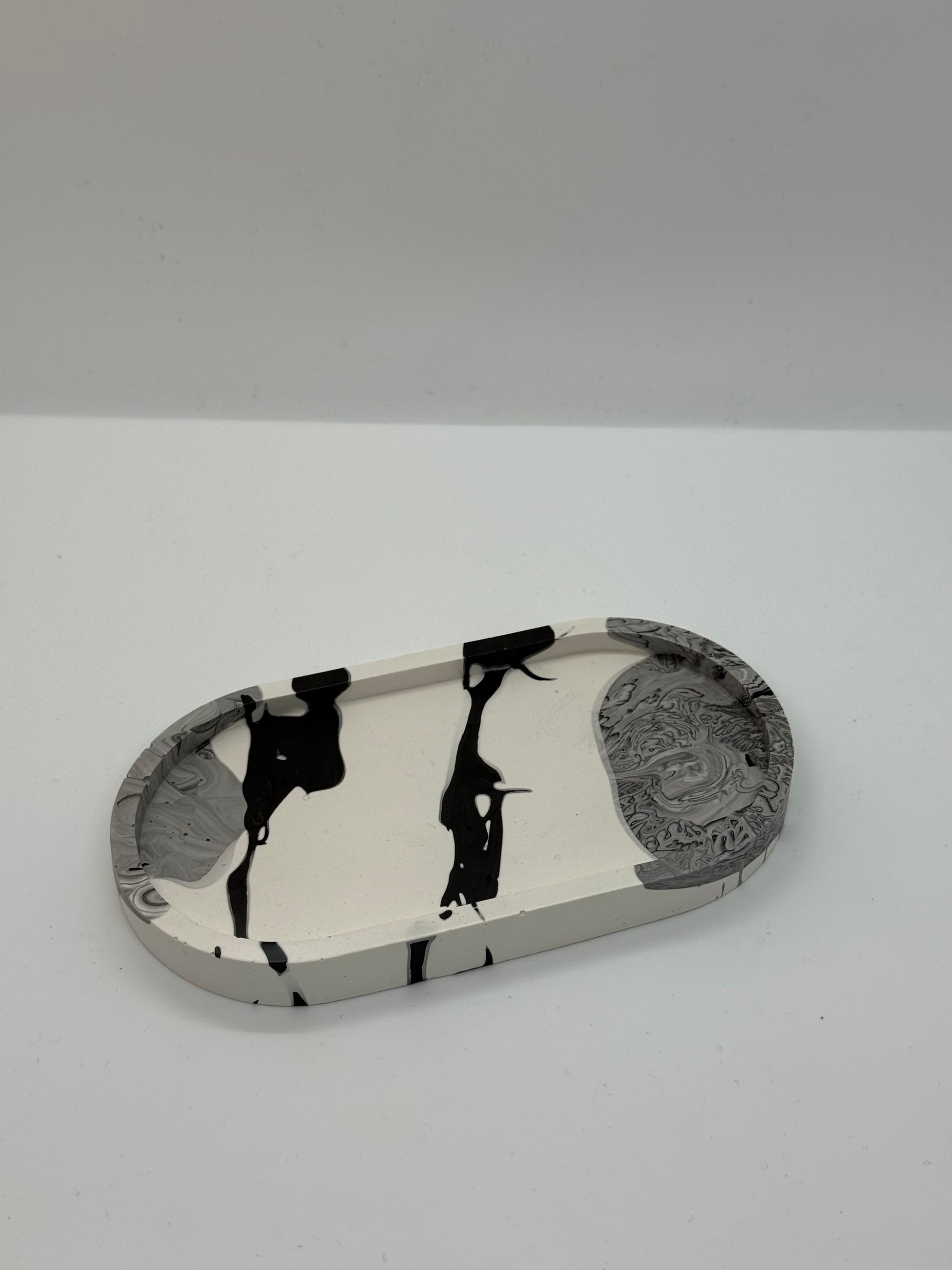 Rankų darbo jesmonito padėkliukas, išsiskiriantis stilingu juodos, baltos ir pilkos spalvų marmuriniu raštu. Kiekvienas potėpis šiame padėkliuke susilieja į unikalią, abstrakčią kompoziciją, todėl nėra dviejų vienodų gaminių.