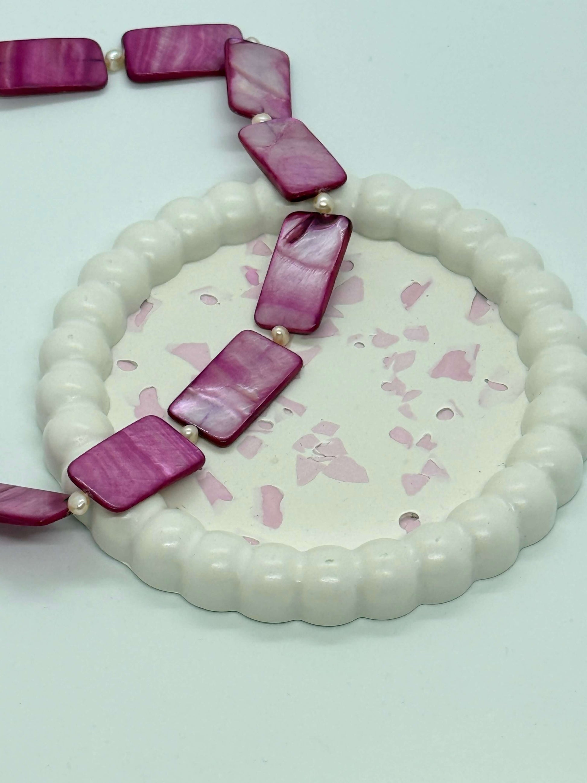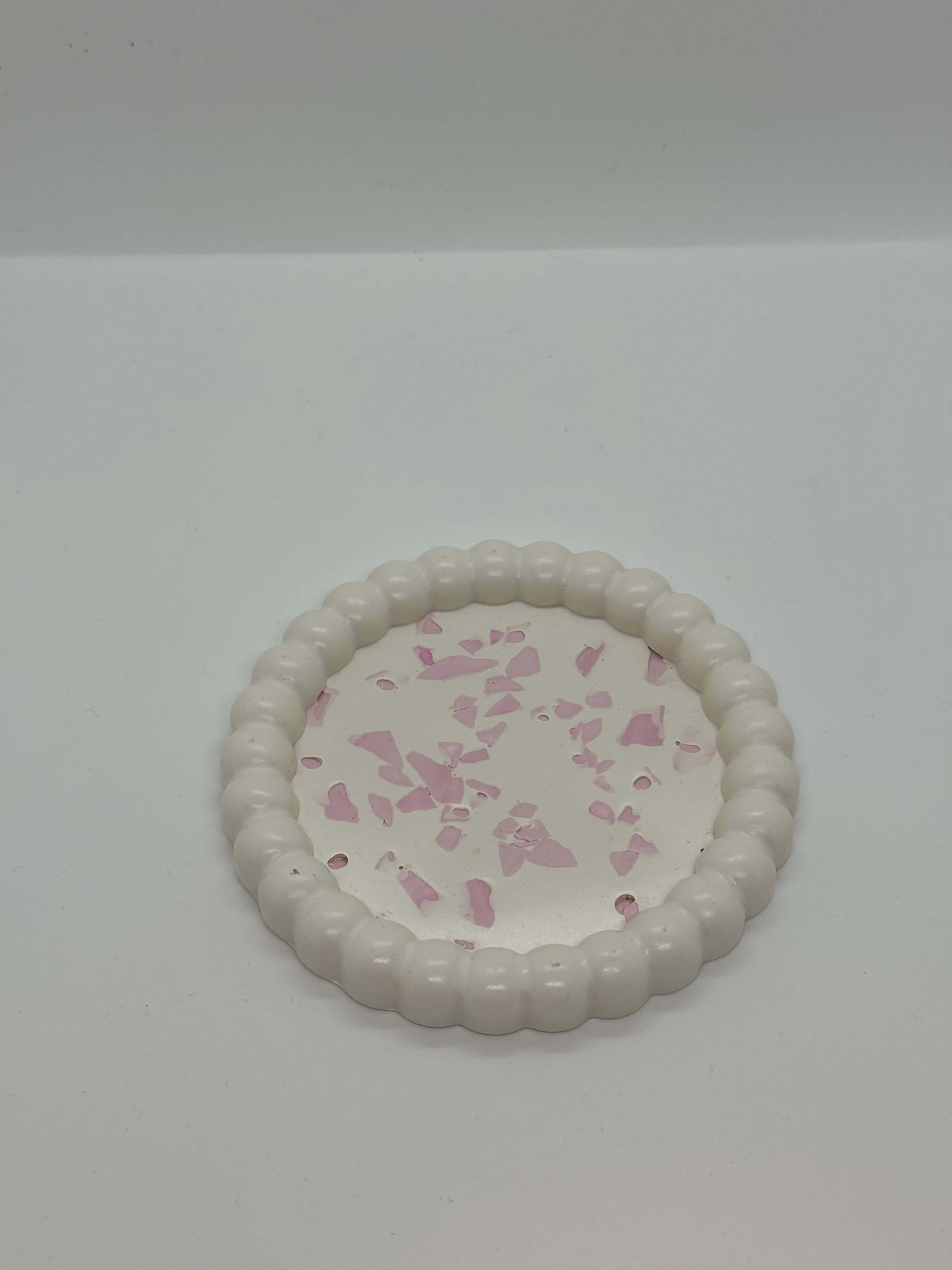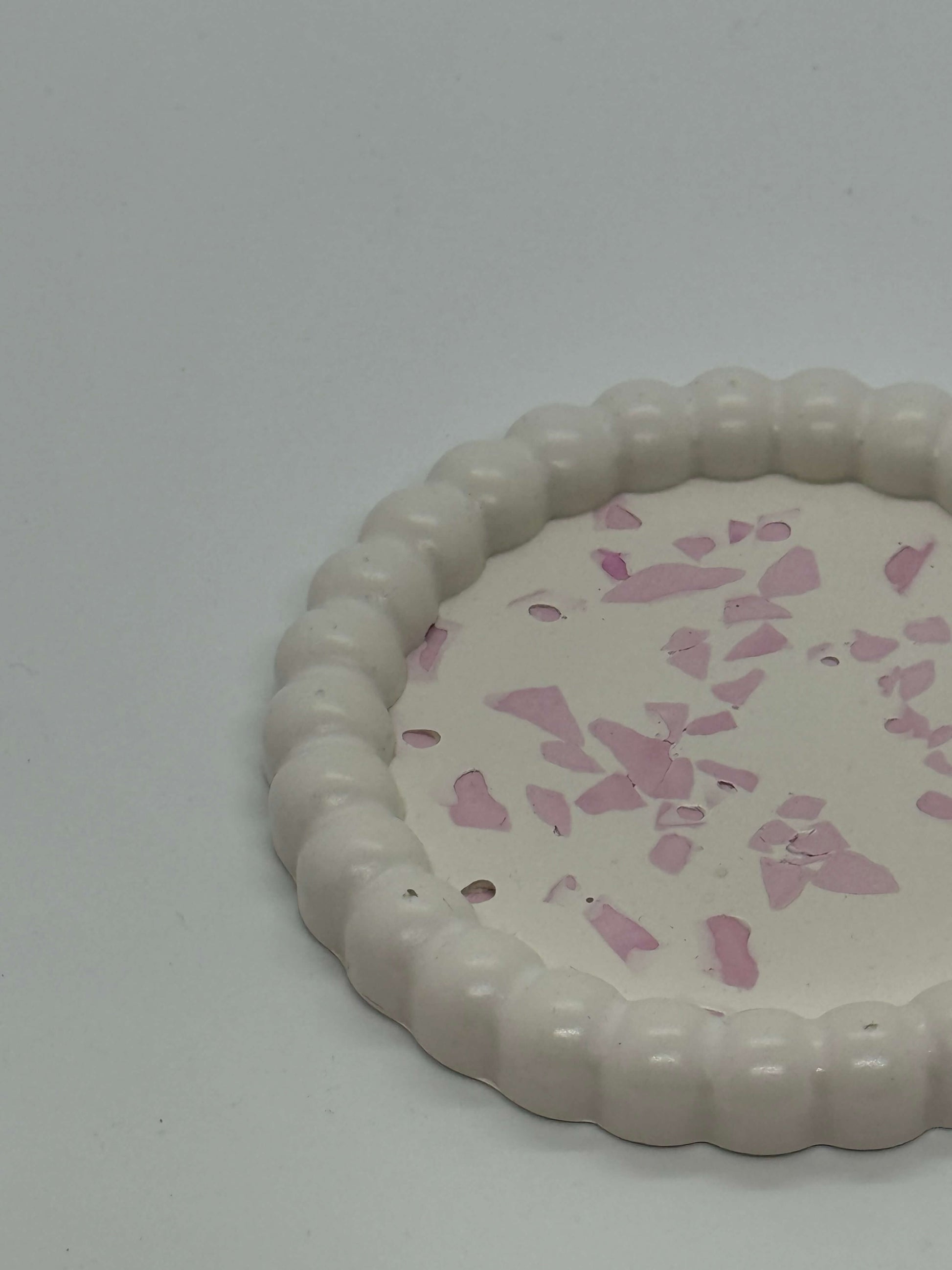 Šis šviesaus kremiško atspalvio padėkliukas, papuoštas rožinėmis terrazzo detalėmis, suteiks jūsų namams švelnaus žaismingumo ir elegancijos. Banguoti kraštai prideda formos išskirtinumo, o rožiniai fragmentai sukuria subtilų, akį traukiantį kontrastą.
