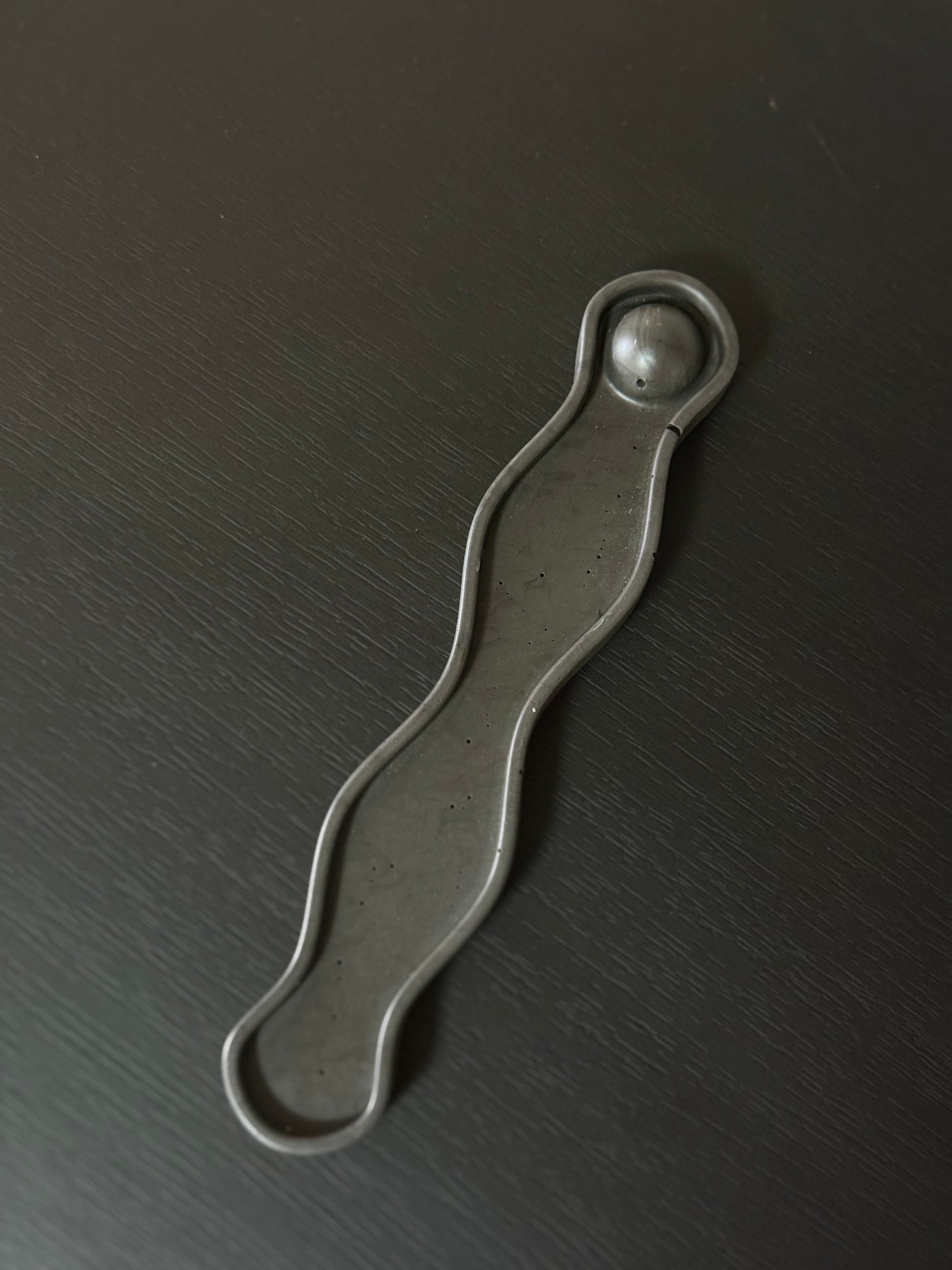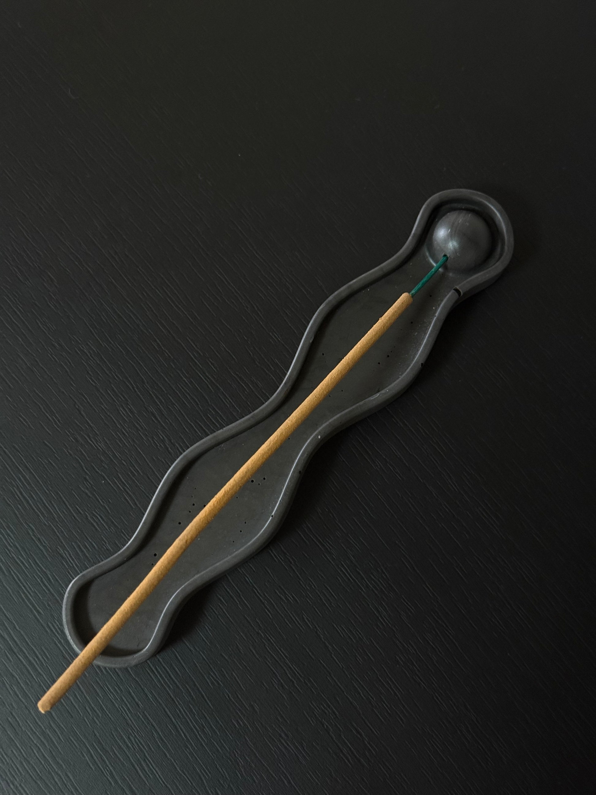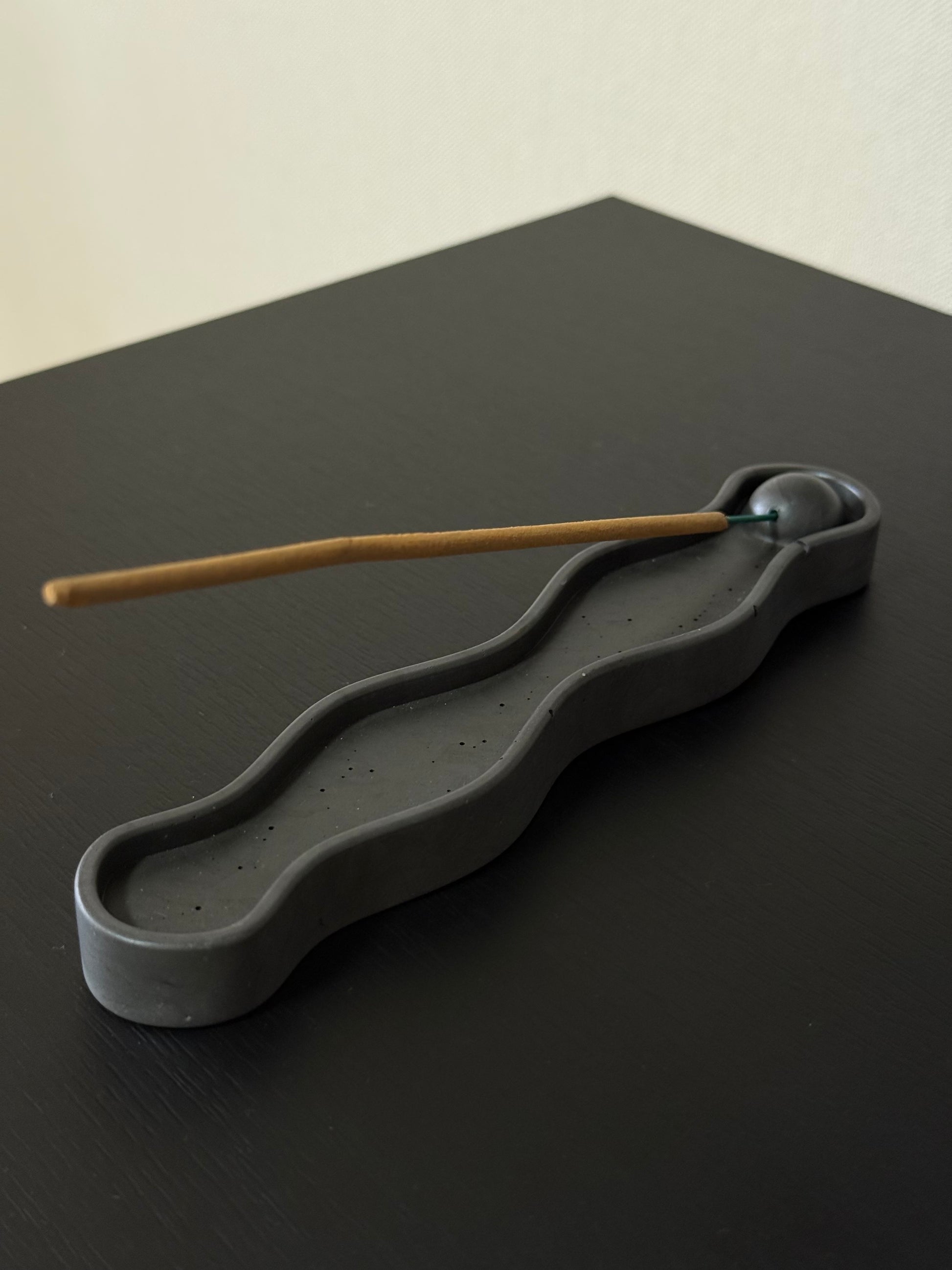Elegantiška ir moderni grafito spalvos smilkalinė, sukurta tiems, kurie vertina ramybę, estetiką ir švarų dizainą. Bangos formos pagrindas subtiliai pagauna pelenus, o apvalus laikiklis stabiliai laiko smilkalą, užtikrindamas saugų ir tvarkingą degimą.
