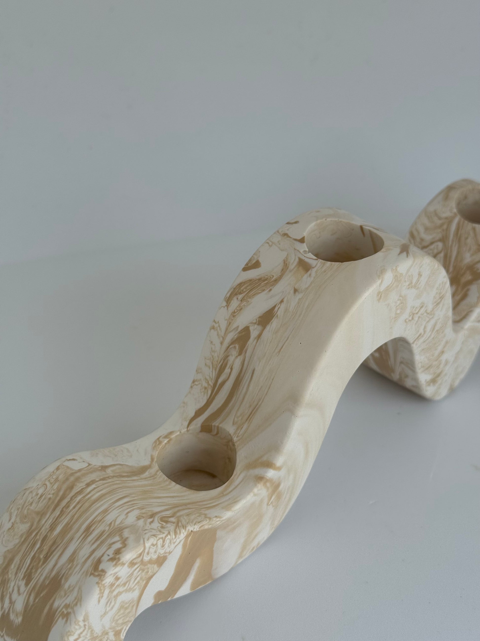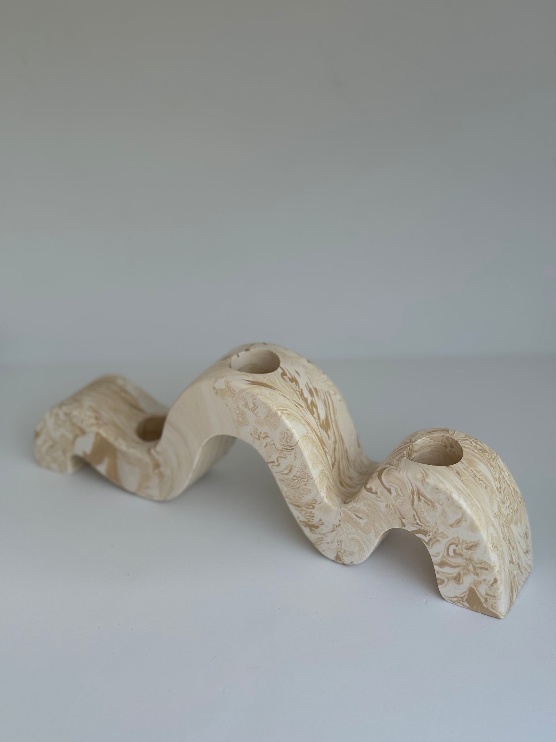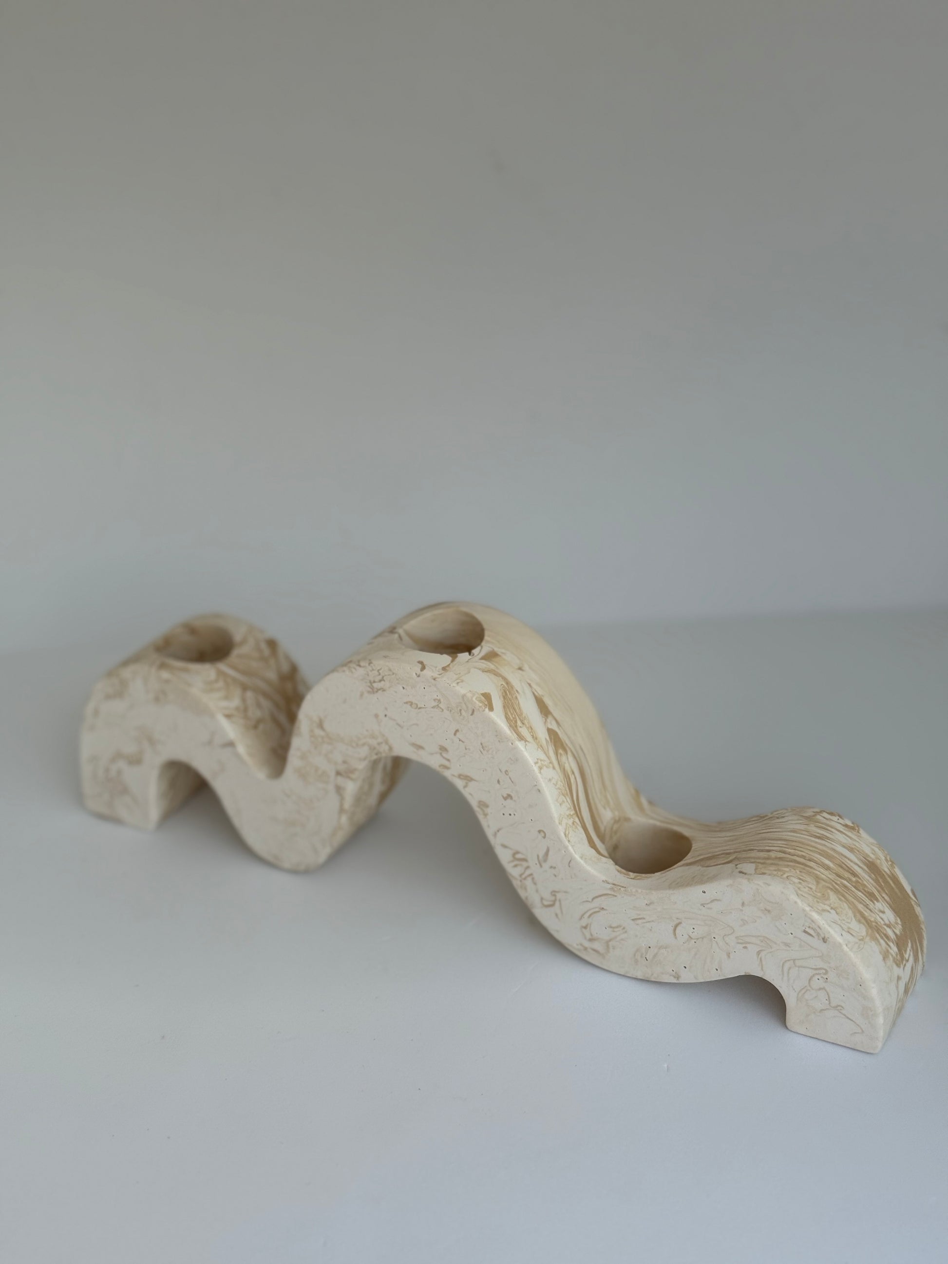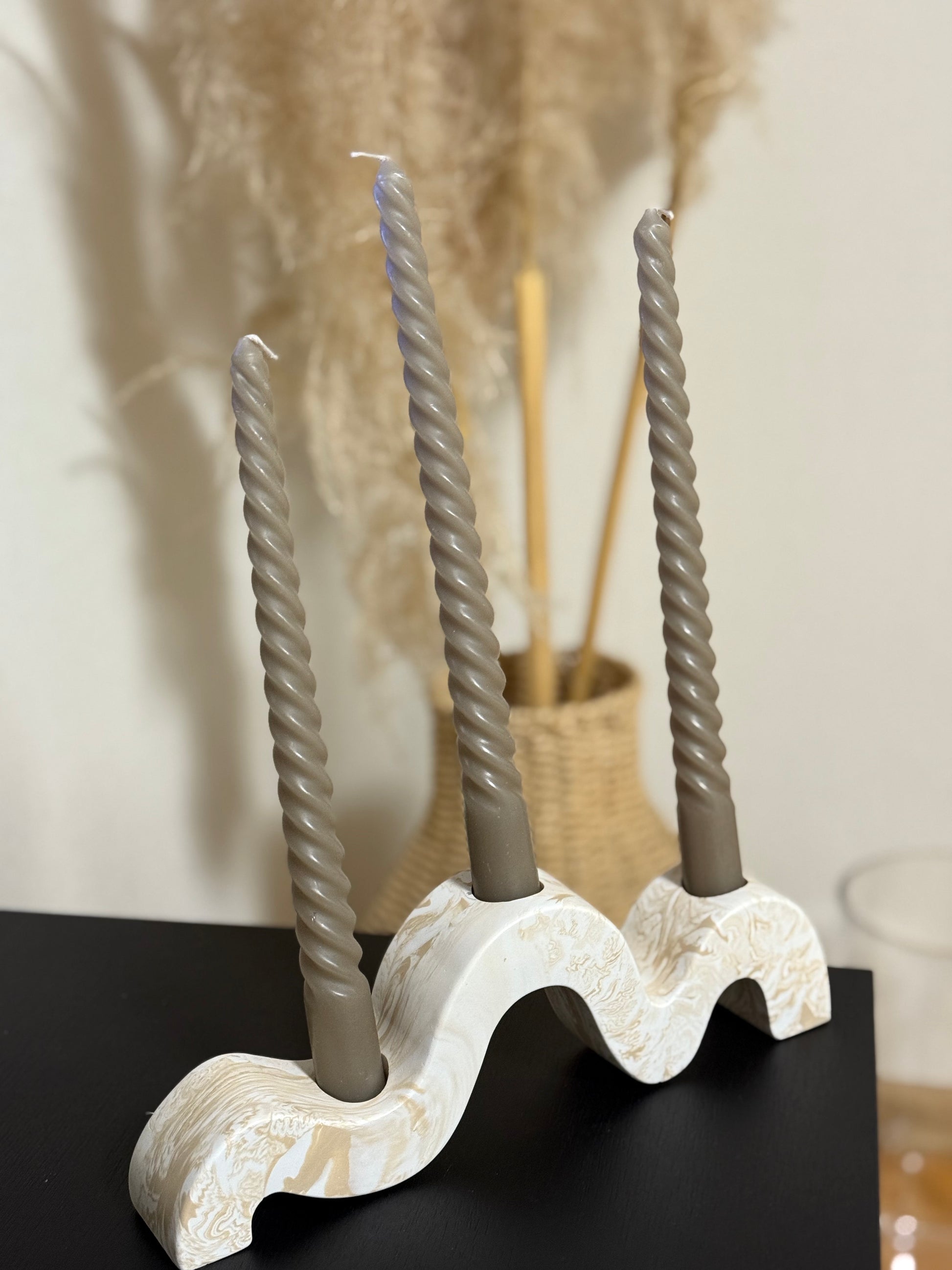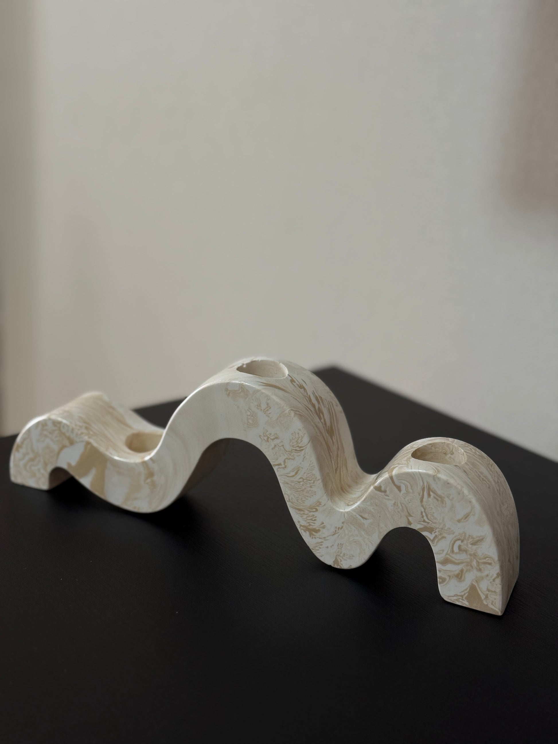 Įneškite jaukumo ir elegancijos į savo namus su šia modernia, banguotos formos žvakide. Iš šviesios marmurinės tekstūros medžiagos pagamintas aksesuaras išsiskiria subtiliais rusvais raštais, kurie kiekvieną žvakidę daro unikalią.
