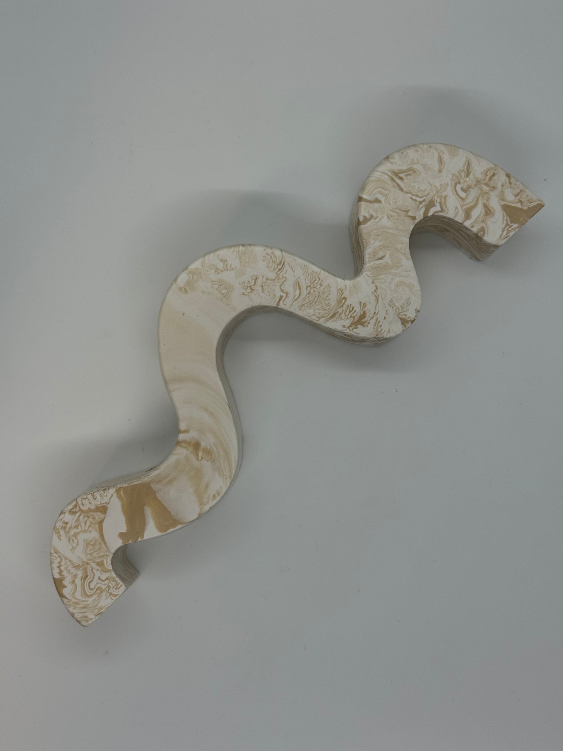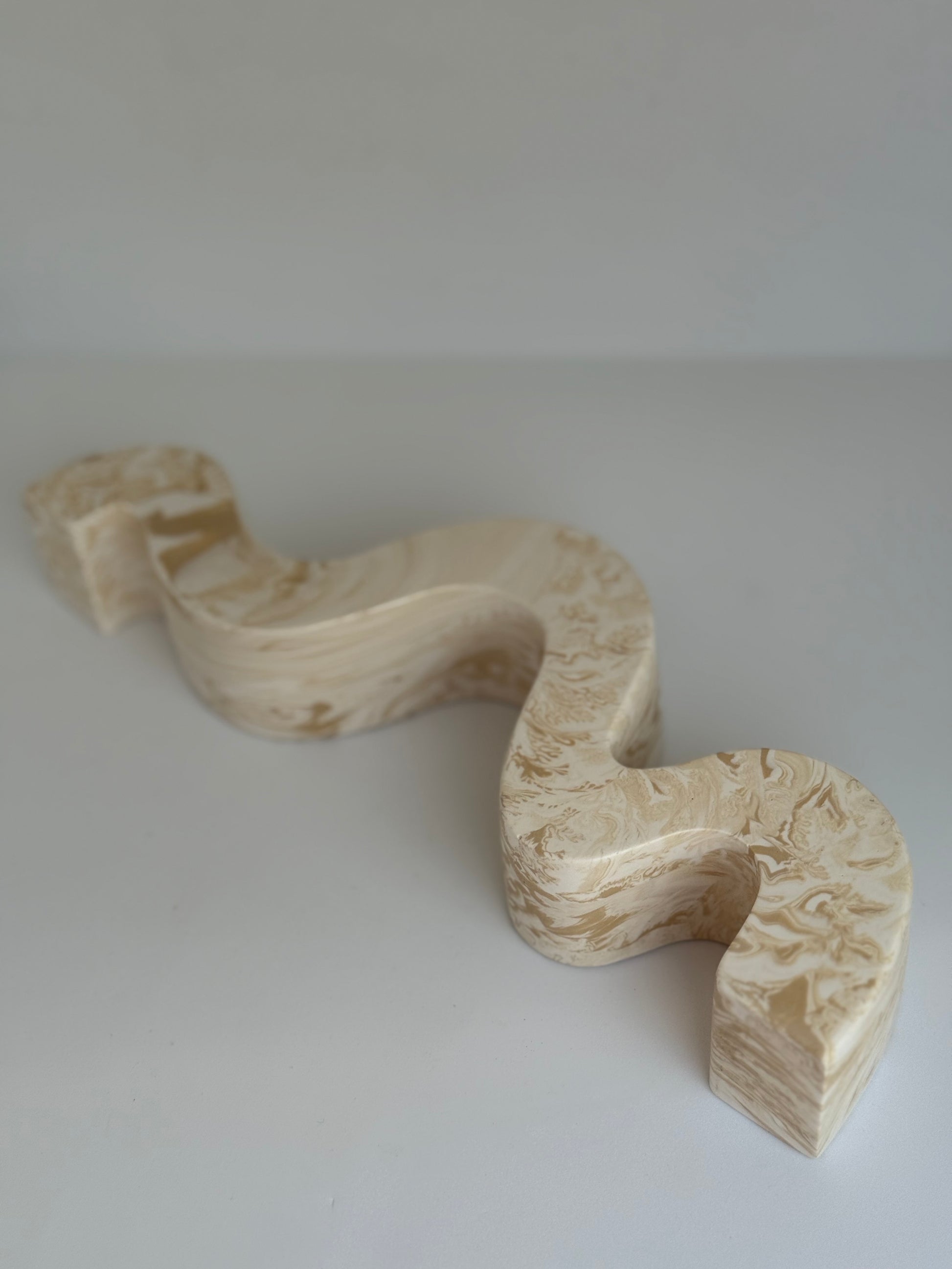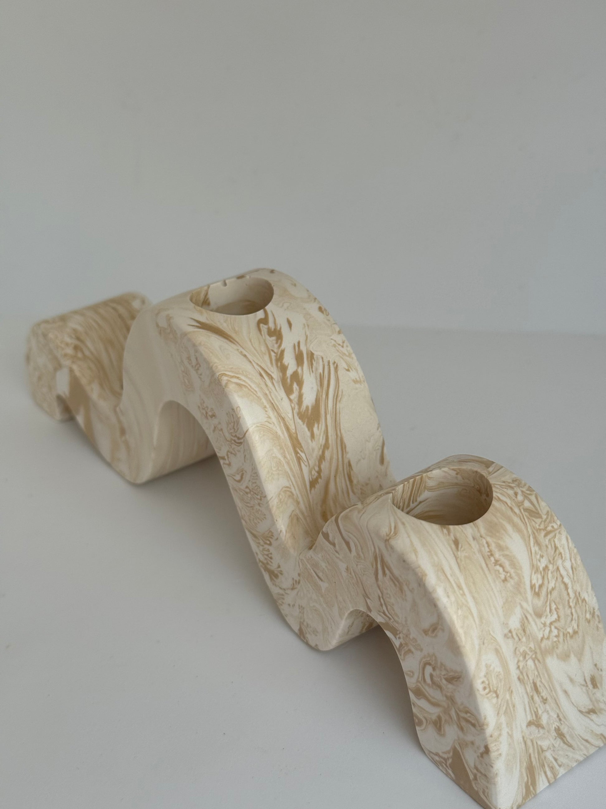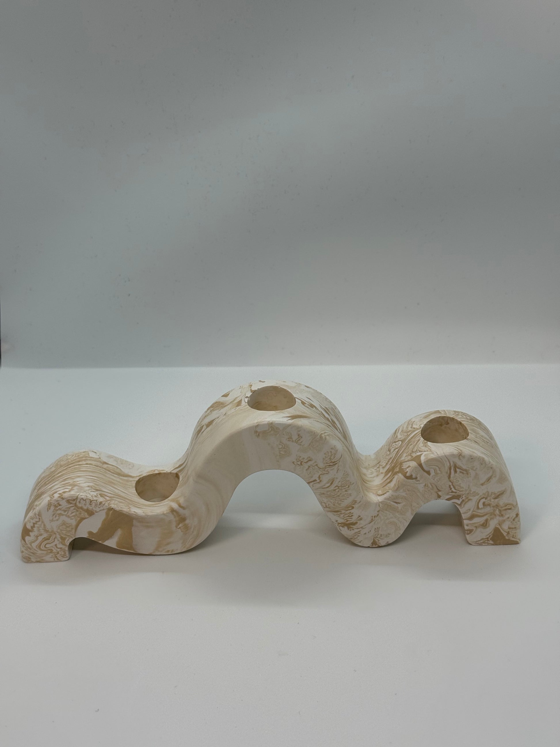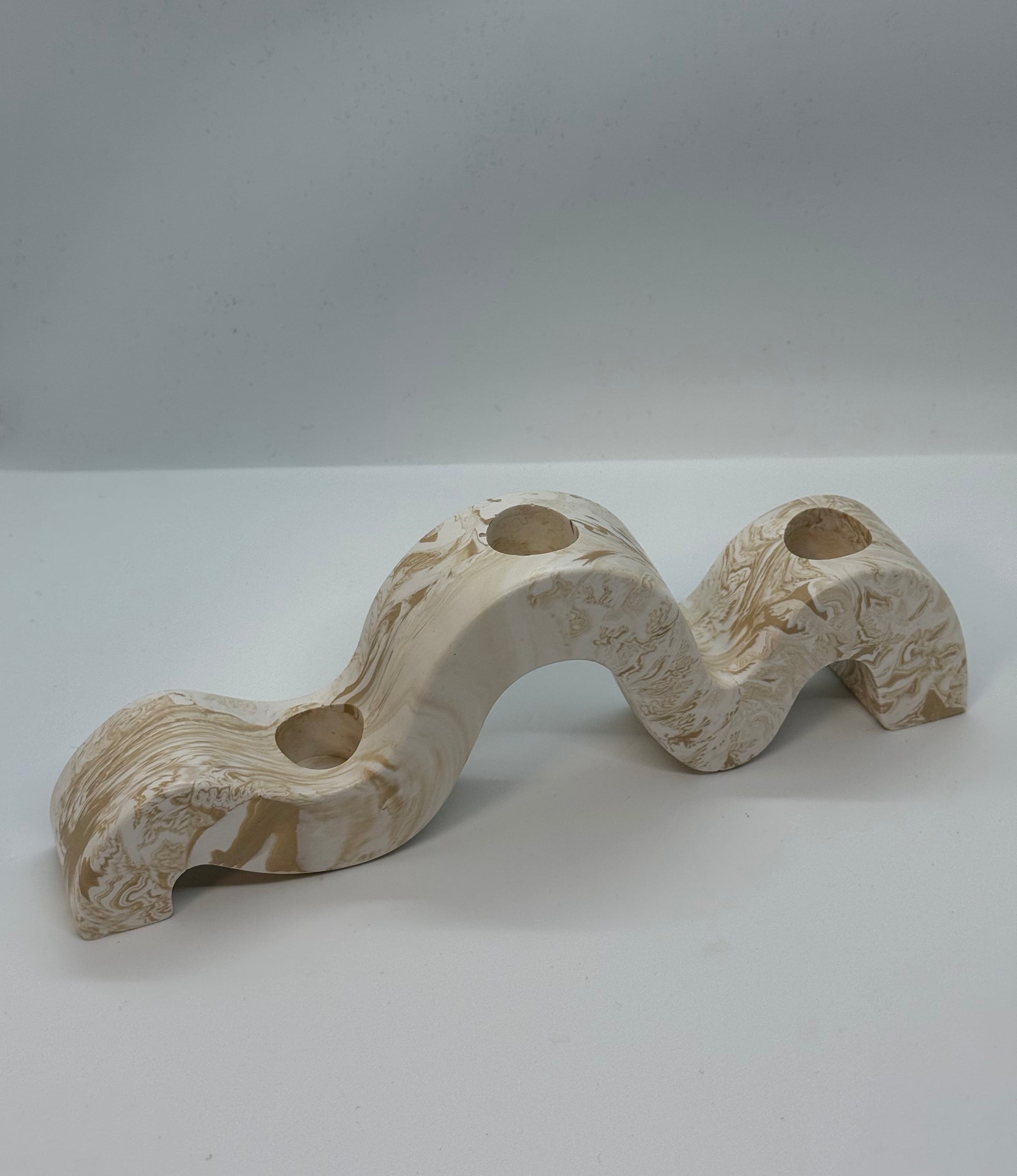 Įneškite jaukumo ir elegancijos į savo namus su šia modernia, banguotos formos žvakide. Iš šviesios marmurinės tekstūros medžiagos pagamintas aksesuaras išsiskiria subtiliais rusvais raštais, kurie kiekvieną žvakidę daro unikalią.